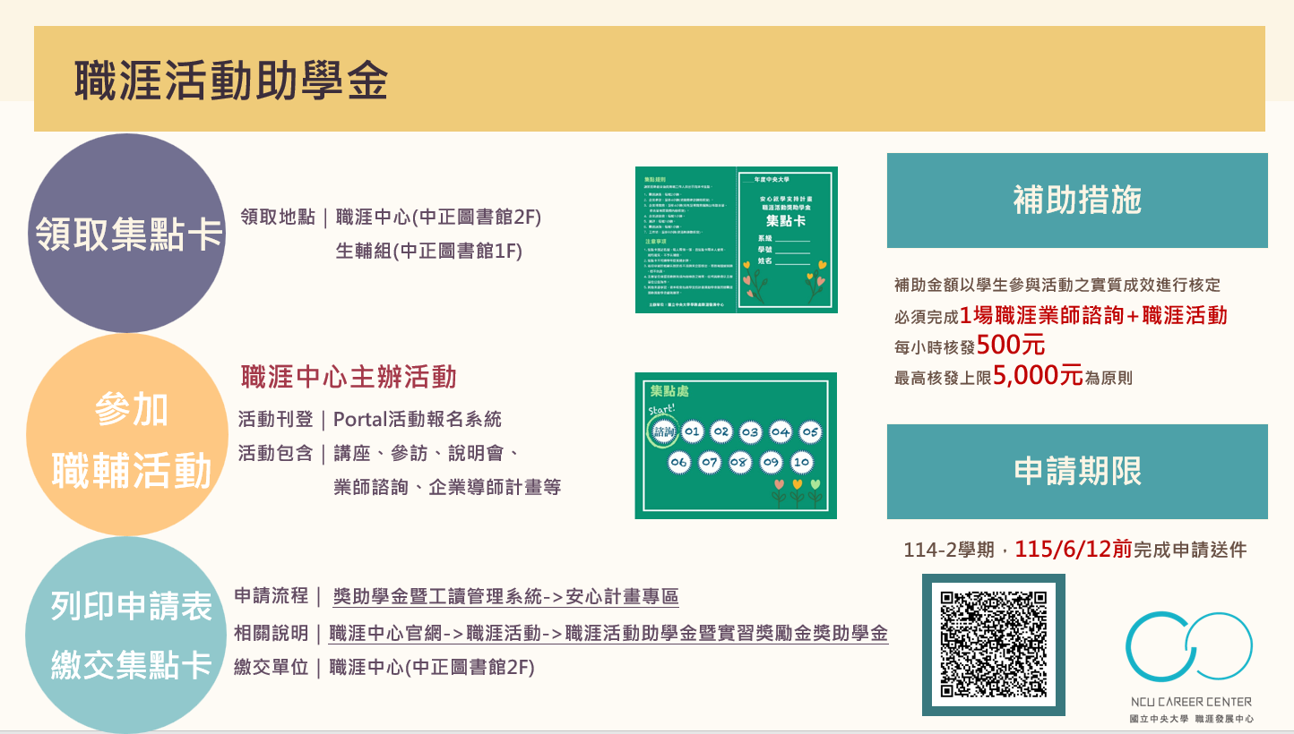 - 申請條件: 必須完成1場職涯業師諮詢 及參加職涯發展中心主辦之職涯輔導活動,並完成以下資料,經審核通過給予助學金。