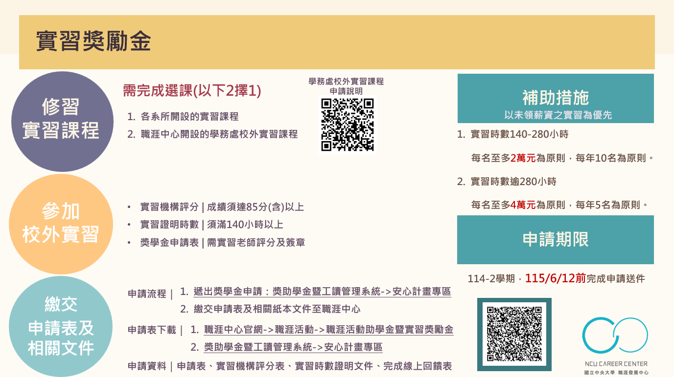 - 申請期間:當年暑假開始前一週內;當年11月的最後一週內。(詳細時間依職涯中心當年度官網公告) 。