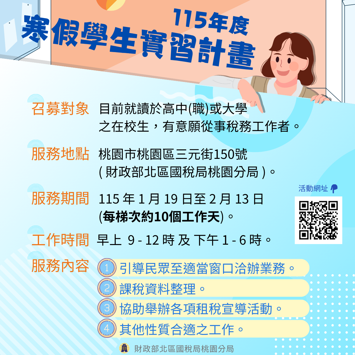 錄取通知:錄取名單將發送至報名所留E-MAIL,並於115年1月12日前,公告於北區國稅局桃園分局臉書粉絲專頁。