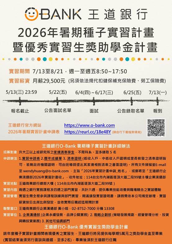 - 或E-mail至wendyhuang@o-bank.com,主旨寫明「申請2026實習計畫_姓名」,所有文件以掃描檔寄送。(Email或紙本寄送擇一即可)