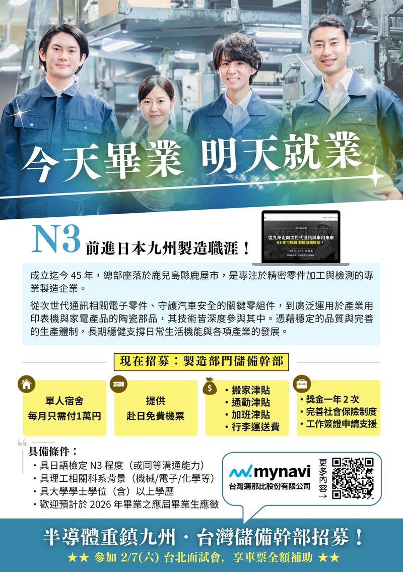 開放「製造管理儲備幹部」招募,日文 N3 即可應徵!!