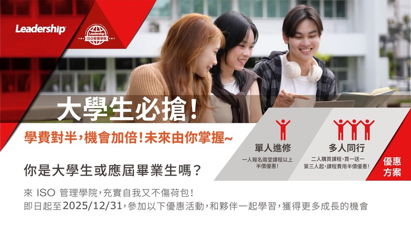 轉知 ISO 管理學院辦理「推動青年學子專業力:大學生限時半價學習優惠專案」相關資訊