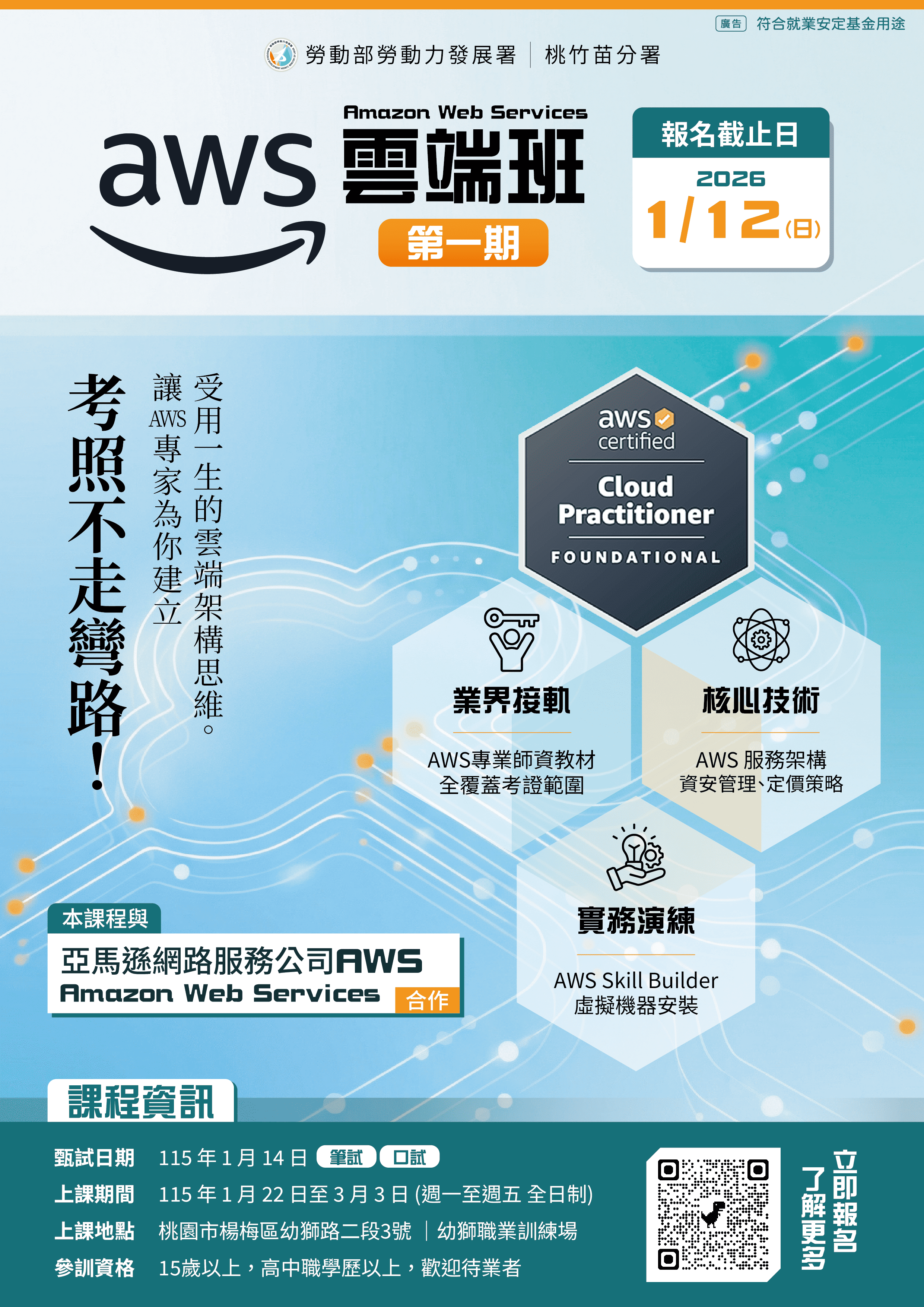 - 官方原廠資源: 由 AWS 原廠認證講師授課並採用官方教材,目標直指 AWS Certified Cloud Practitioner 國際證照。