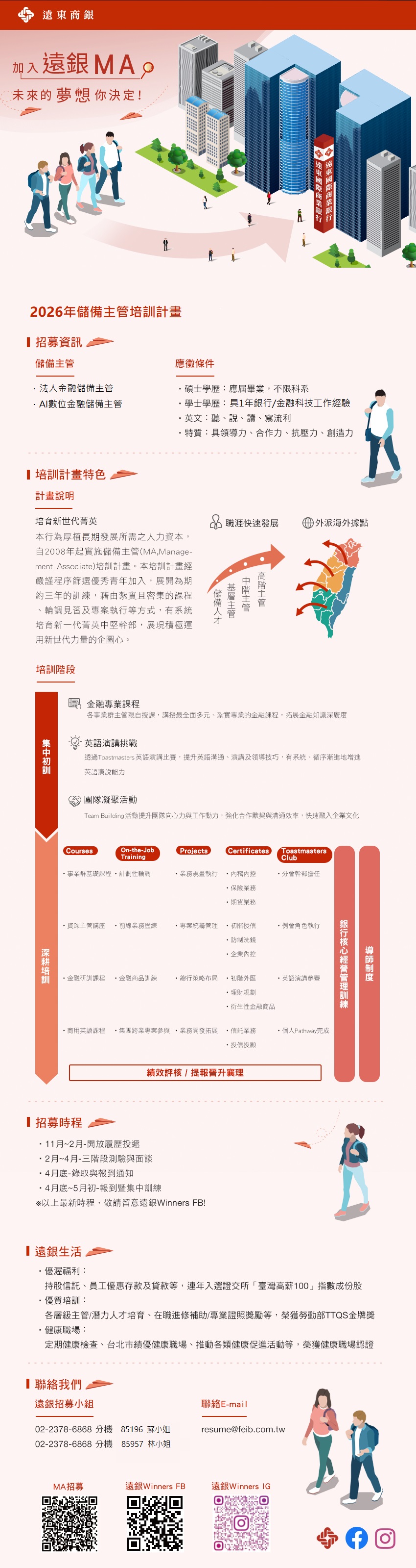 - 詳情請見2026遠銀MA招募網站:https://www.feib.com.tw/upload/HR/event/MA/index.html