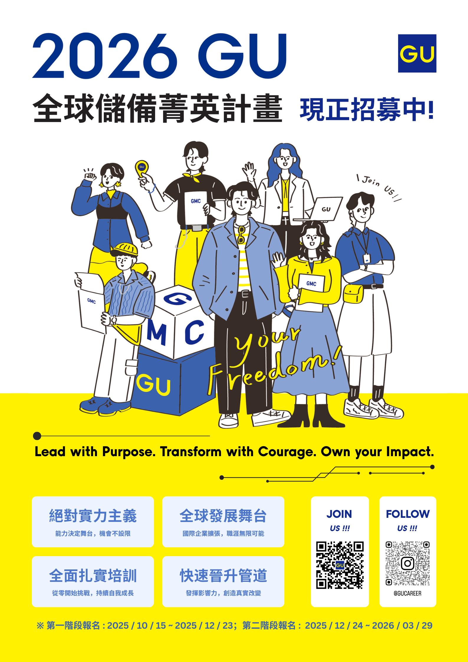 GU 是以「YOUR FREEDOM 讓時尚更自由」做為品牌理念,致力讓人們實踐享受時尚、自由穿搭的零售企業。每年舉辦全球儲備菁英計畫,招募頂尖且具潛力人選。