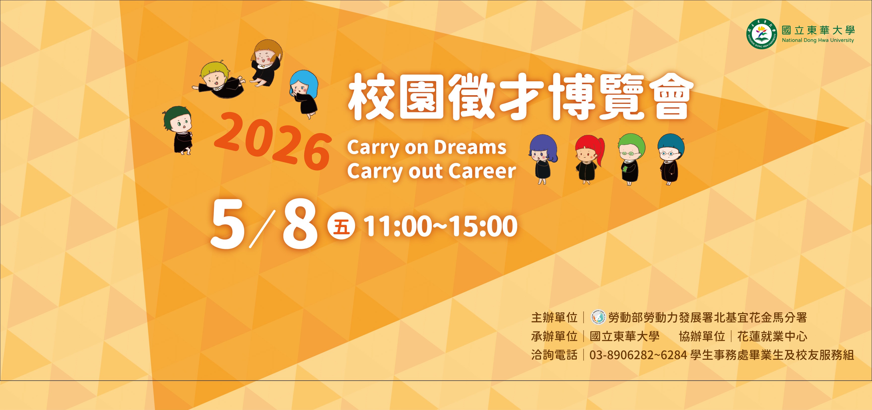 國立東華大學於115年5月8日舉辦「2026校園徵才博覽會」,敬請同學踴躍參與📌活動時間:115年5月8日(五)11:00-15:00📌活動地點:本校壽豐校區圖書館前空地及小葉欖仁大道綠廊通道📌活動網址:https://rc195.ndhu.edu.tw/