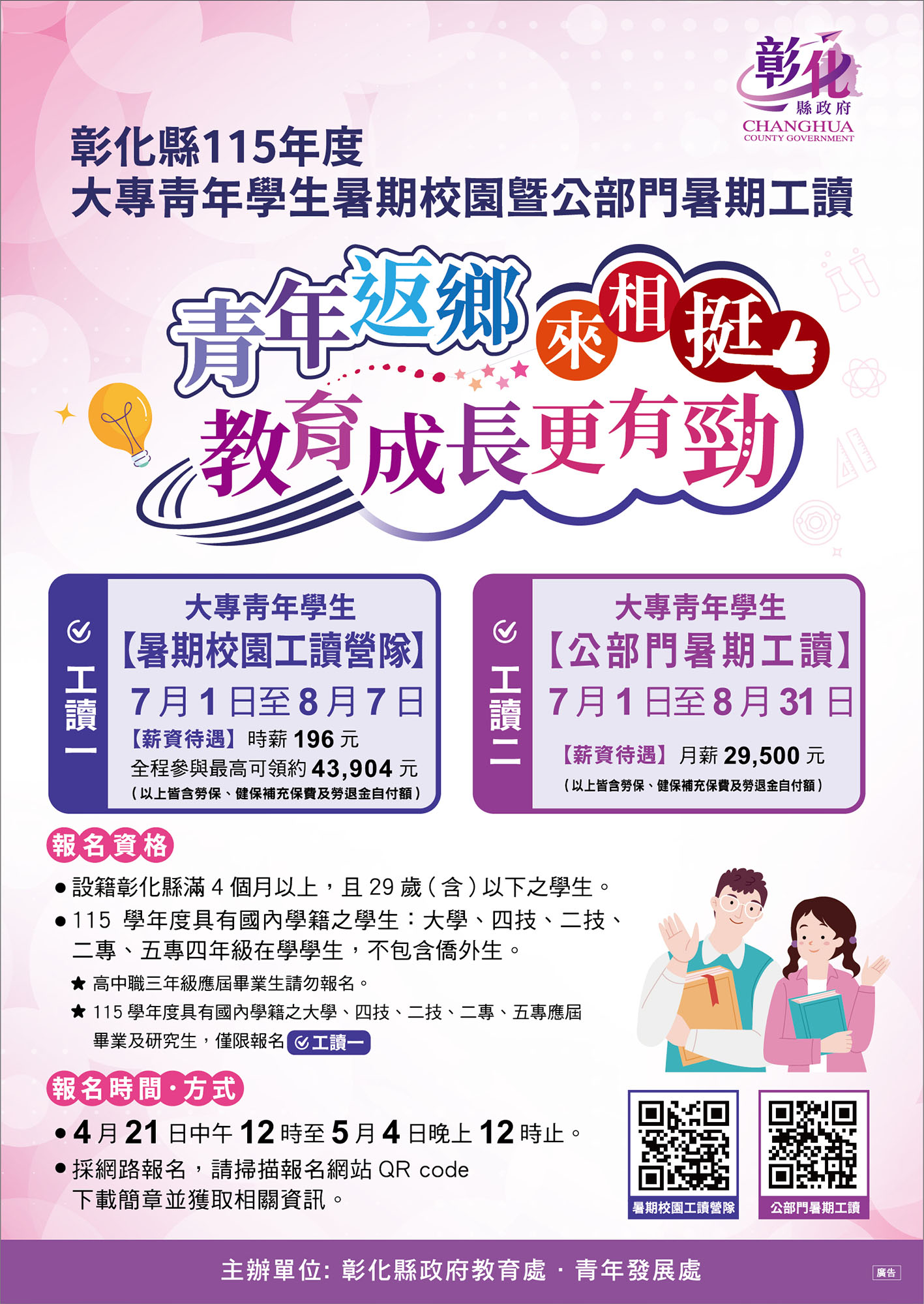 (二)青發處公部門暑期工讀:彰化縣政府各局處及所屬機關。 報名網址: